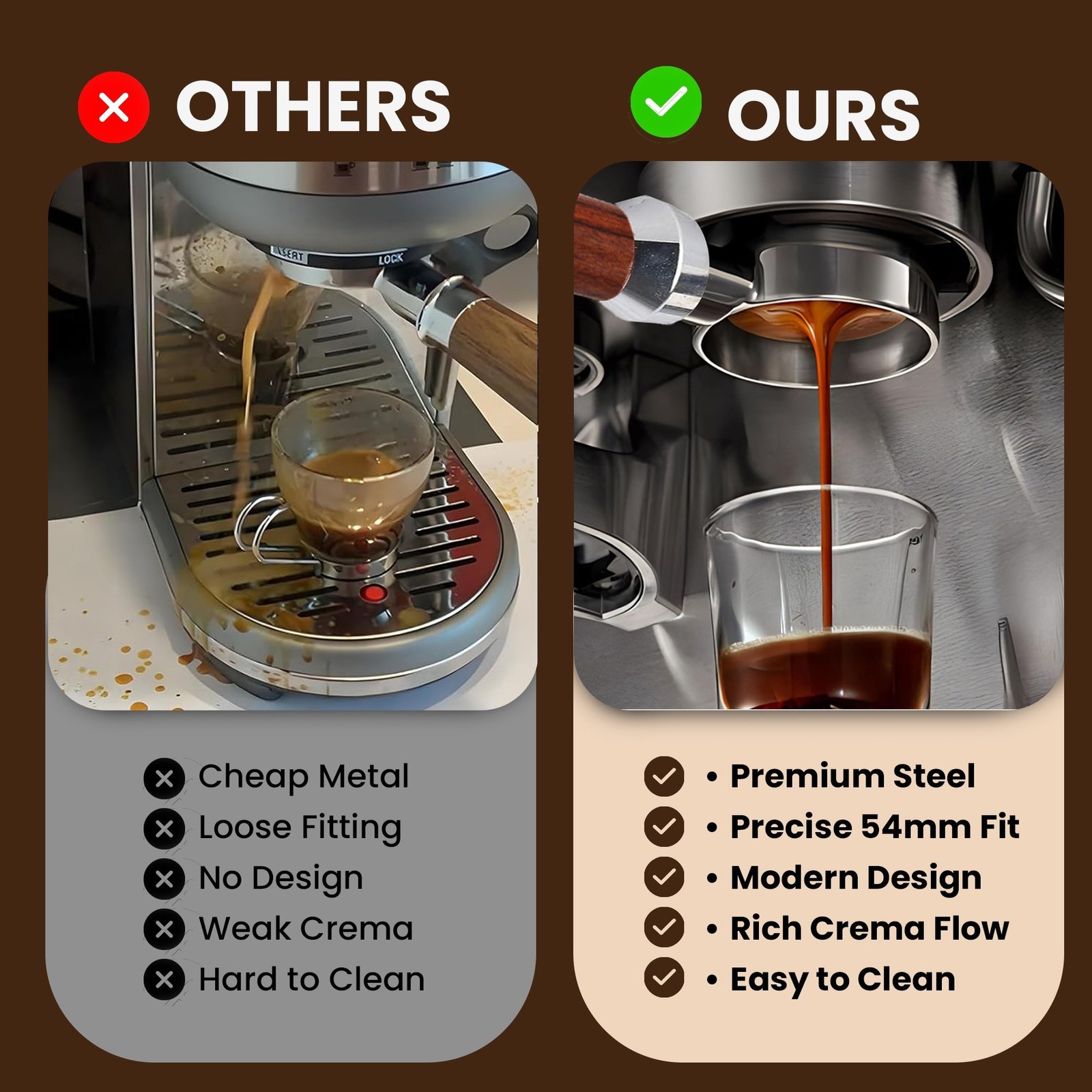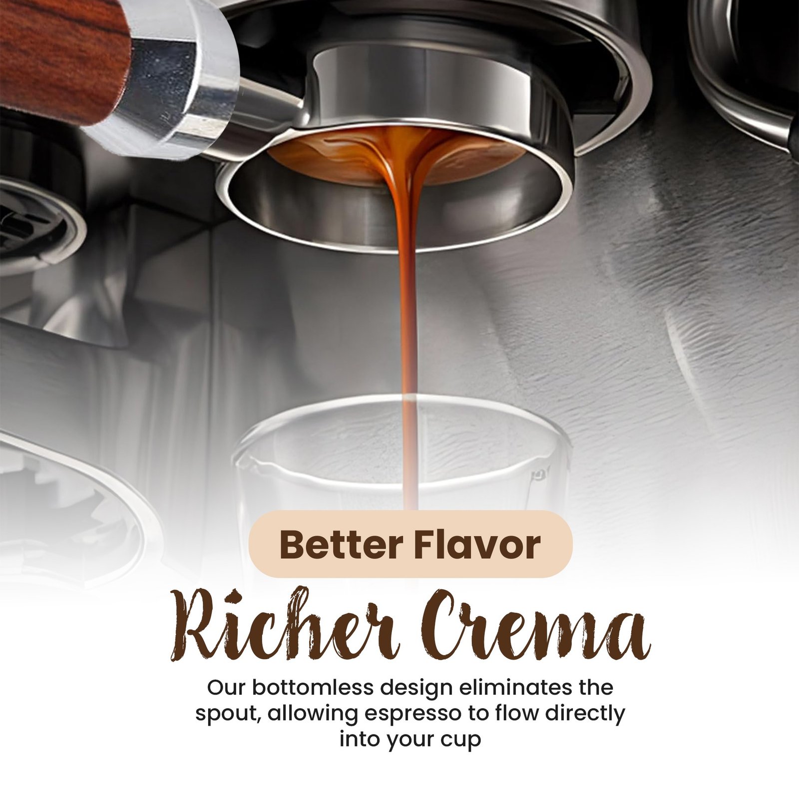 The 54mm portafilter’s bottomless design provides full visibility of the extraction process, allowing you to monitor flow and refine your technique for optimal results. The precision-engineered filter basket controls water flow, enabling even extraction and enhanced crema formation for a layered, flavorful espresso.